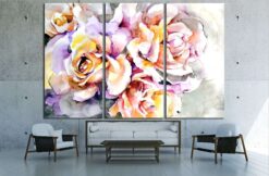 Beautiful flowers Delicate yellow and pink roses on gray and blue background Canvas Art Wall Decor 3 Piece Canvas Prints Artwork