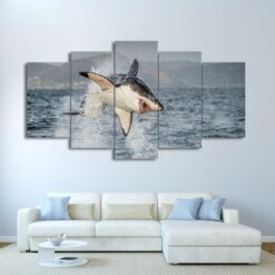 Great White Shark Jumping Breach Air Jaws Ocean – 5 Panel Canvas Art Wall Decor