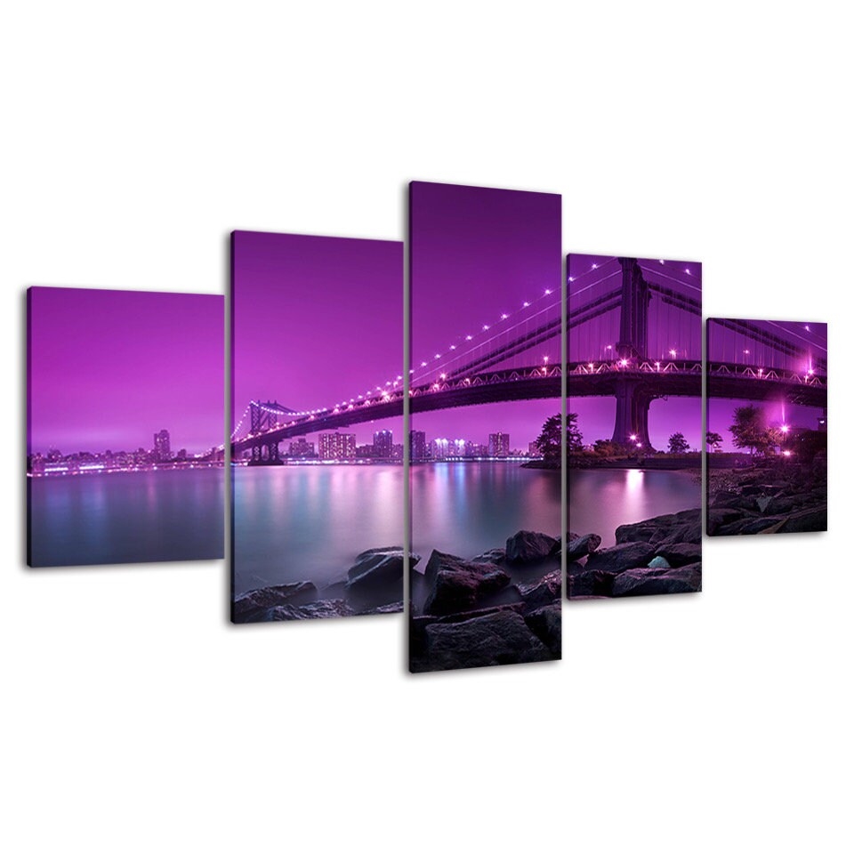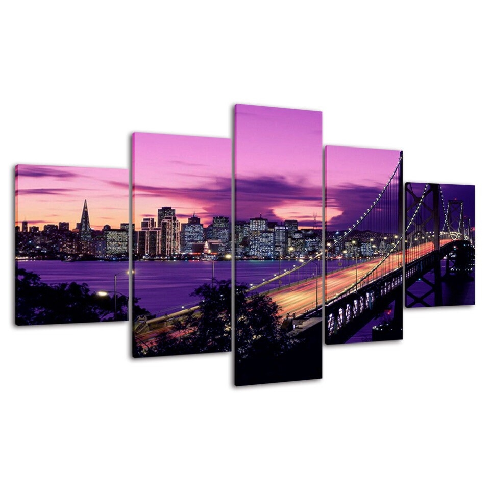 Purple Dawn Modern City Bridge Landscape Canvas Wall Art, Framed 5 Panel Canvas Wall Art