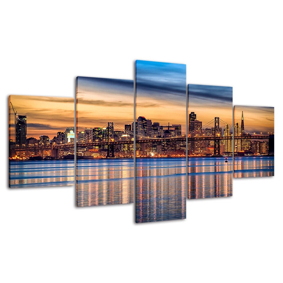 San Francisco Night City Canvas Wall Art, Framed 5 Panel Canvas Wall Art
