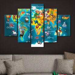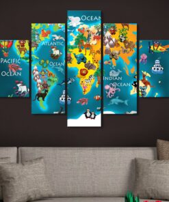 Animals of the World – Kids’s Map – 5 Piece Canvas Art Wall Decor
