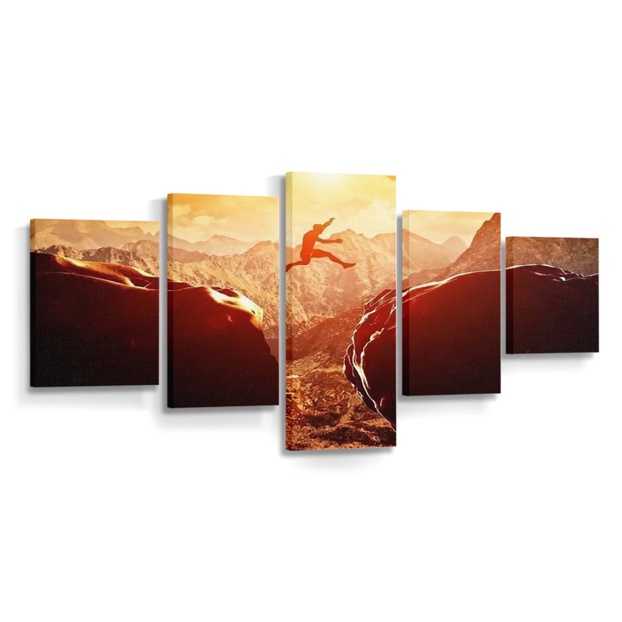 Man Jumping Over Precipice Between Two Rocky Mountains Canvas Wall Art, Bedroom Wall Art, Framed Canvas