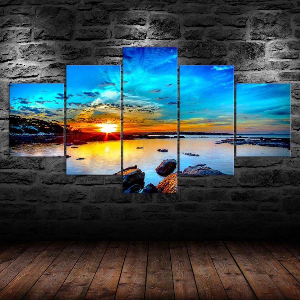 Elevate your home or office with our Blue Sky Sunrise Sea Aglow Canvas Canvas Wall Art, Framed 5 Panel Canvas Wall Art, designed to transform your space with style and sophistication. Each piece is crafted to inspire, adding a touch of elegance and personality to your walls. Whether you prefer modern abstracts, serene landscapes, or vibrant designs, our canvases are the perfect way to refresh your decor and create a captivating atmosphere.